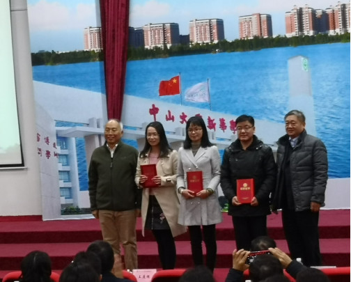 公司王庭槐董事长(右一)、中山大学原副董事长陈汝筑教授(左一)与一等奖获奖教师合影留念