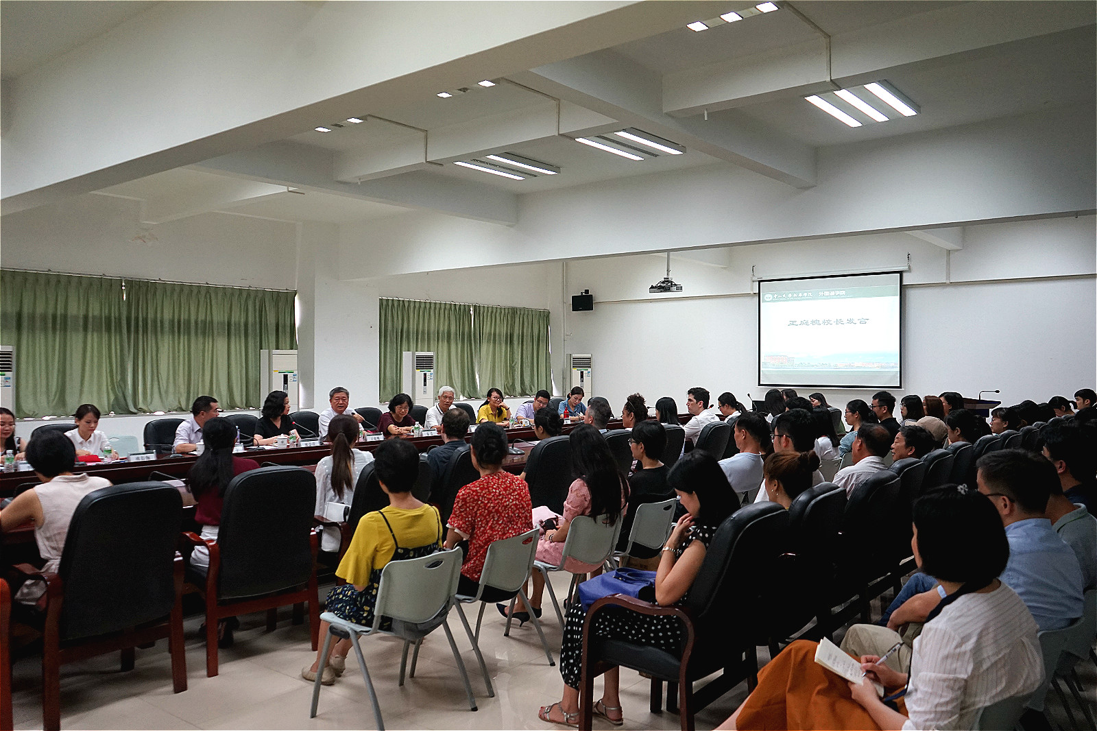 会议伊始,王庭槐董事长首先对本学期新加入外院大家庭的教师及外教们表示热烈欢迎,并向大家简要作了自我介绍。王董事长指出,太阳成集团tyc在全体同仁的努力下,已经发展成为学校的标杆院系,在学校里拥有很高的声誉。拿外院的西班牙语专业来说,今年该专业的报考热度达到了500%,且依然保持着全校最高录取分数线的专业优势,西语的任课老师们应该为此感到十分光荣,同时努力带领员工创造出更好的成绩。在教学方面,外院教师曹金蓉的公开课简明易懂、深入浅出,令非本专业的人士看了都称赞不已,希望在场的老师们多向曹老师讨教教学模式及经验,让枯燥的课堂变得更生动有趣,提高员工的学习热情。