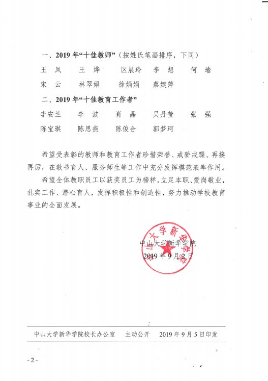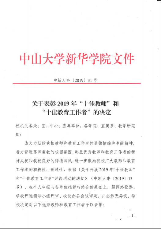 根据《关于开展2019年“十佳教师”和“十佳教育工作者”评选活动的通知》(中新人事〔2019〕13号)文件要求,经个人申报与单位推荐,人事处、教务处、学科与科技管理处审核、全校师生网络投票、信息与网络管理处统计票数等程序,学校评选领导小组评议会评议,董事长办公会审定,入选中山大学新华学院2019年“十佳教师”的教师有9位,入选中山大学新华学院2019年“十佳教育工作者”的教师有9位。