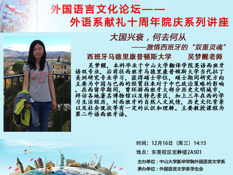 吴梦醒,本科毕业于中山大学翻译学院英语西班牙语双专业,后前往西班牙马德里康普顿斯大学当代拉丁美洲研究专业学习,获得硕士学位,硕士期间研究方向主要为中国与巴西的经贸往来对于中巴政治策略的影响。在西留学期间,曾环游西班牙大部分历史文明城市,拜访各地著名博物馆以及特色景区,加上三年在西的学习生活经历,对西班牙的自然人文风情,历史文化背景以及社会现状等有一定的认识和理解。主要教授课程为第二外语西班牙语。