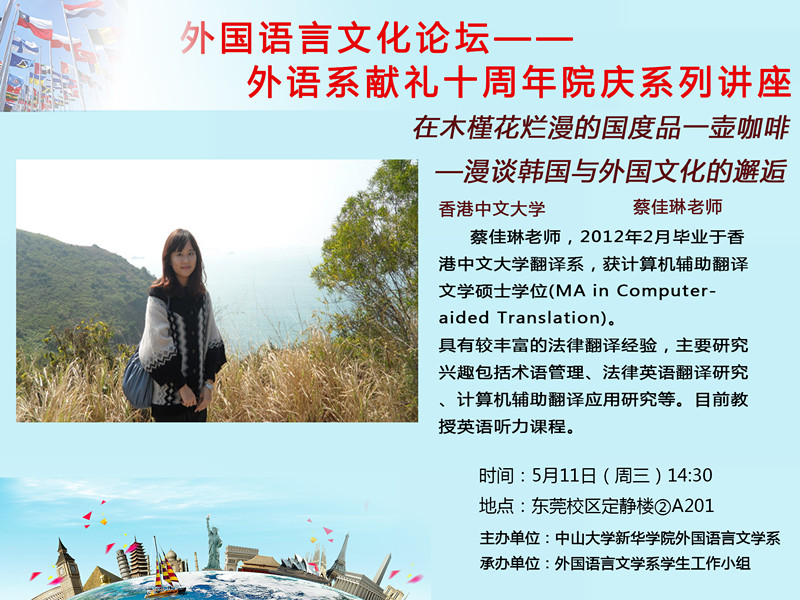 蔡佳琳,助教,2012年2月毕业于香港中文大学翻译系,获计算机辅助翻译文学硕士学位(MA in Computer-aided Translation)。具有较丰富的法律翻译经验,主要研究兴趣包括术语管理、法律英语翻译研究、计算机辅助翻译应用研究等。目前教授英语听力课程。