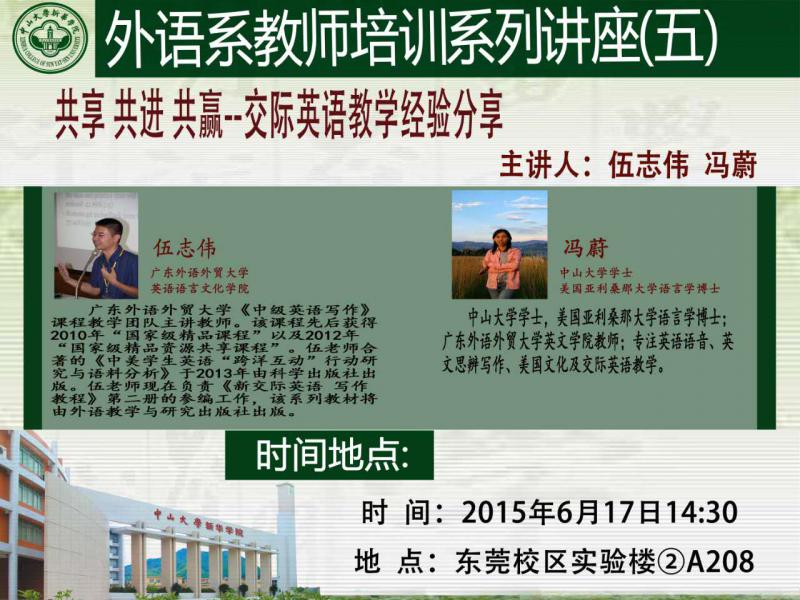 伍志伟,广东外语外贸大学《中级英语写作》课程教学团队主讲教师。该课程先后获得2010年“国家级精品课程”以及2012年“国家级精品资源共享课程”。伍老师合著的《中美员工英语“跨洋互动”行动研究与语料分析》于2013年由科学出版社出版。伍老师现在负责《新交际英语写作教程》第二册的参编工作,该系列教材将由外语教学与研究出版社出版。