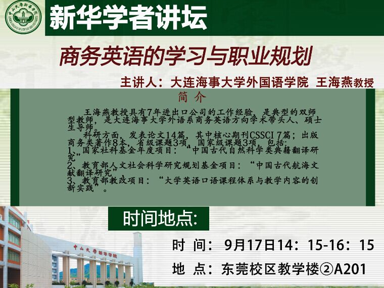 王海燕教授具有7年进出口公司的工作经验,是典型的双师型教师。是大连海事大学外语系商务英语方向学术带头人、硕士生导师。科研方面,发表论文14篇,其中核心期刊CSSCI 7篇;出版商务类著作8本,省级课题3项,国家级课题3项,包括1)国家社科基金年度项目:“中国古代自然科学类典籍翻译研究”2)教育部人文社会科学研究规划基金项目:“中国古代航海文献翻译研究”,3)教育部教改项目:“大学英语口语课程体系与教学内容的创新实践”。