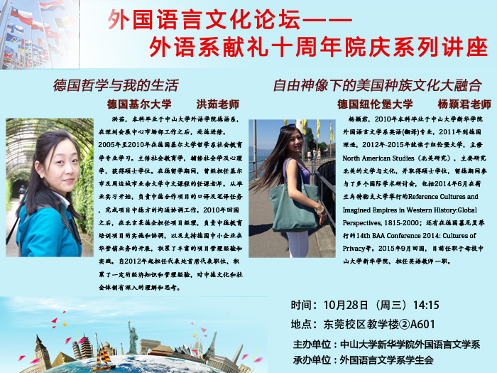 2010年本科毕业于中山大学新华学院外国语言文学系英语(翻译)专业,2011年到德国深造,2012年-2015年就读于纽伦堡大学,主修North American Studies(北美研究),主要研究北美的文学与文化,并取得硕士学位,留德期间参与了多个国际学术研讨会,包括2014年6月在荷兰乌特勒支大学举行的Reference Cultures and Imagined Empires in Western History:Global Perspectives, 1815-2000;还有在德国慕尼黑举行的14th BAA Conference 2014: Cultures of Privacy等。2015年9月回国,目前任职于母校中山大学新华学院,担任英语教师一职。