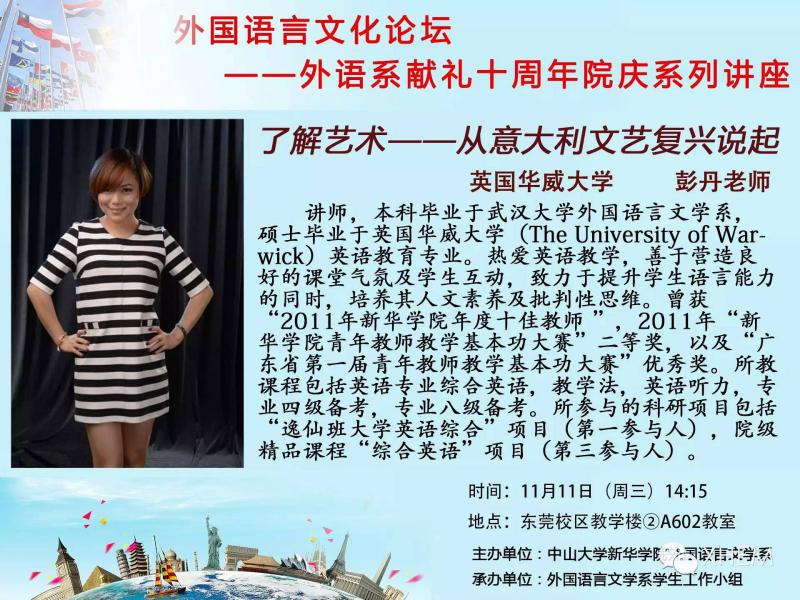 彭丹 讲师,本科毕业于武汉大学外国语言文学系,硕士毕业于英国华威大学(The University of Warwick)英语教育专业。热爱英语教学,善于营造良好的课堂气氛及员工互动,致力于提升员工语言能力的同时,培养其人文素养及批判性思维。曾获“2011年新华学院年度十佳教师 ”,2011年“新华学院青年教师教学基本功大赛”二等奖,以及“广东省第一届青年教师教学基本功大赛”优秀奖。所教课程包括英语专业综合英语,教学法,英语听力,专业四级备考,专业八级备考。所参与的科研项目包括“逸仙班大学英语综合”项目(第一参与人),院级精品课程“综合英语”项目(第三参与人)。