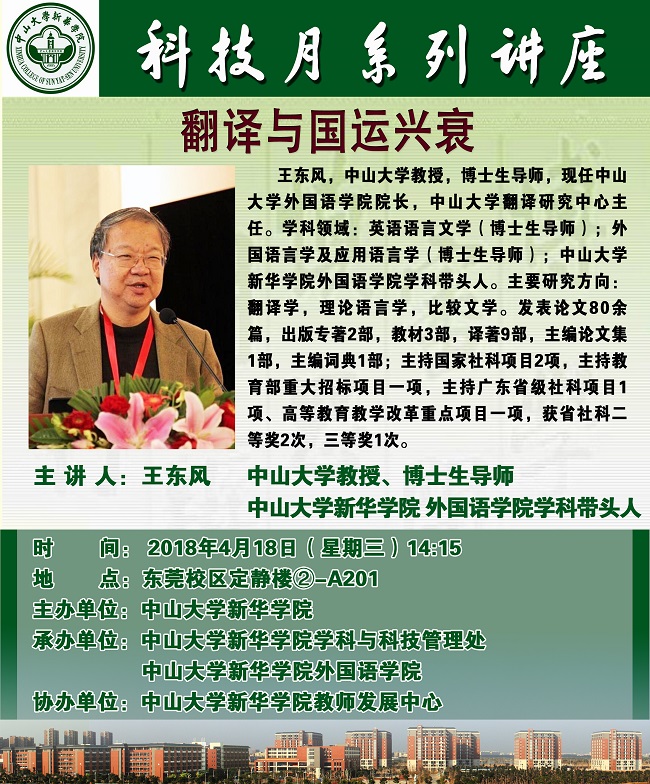 王东风,中山大学教授,博士生导师,现任中山大学太阳成集团tyc经理,中山大学翻译研究中心主任。学科领域:英语语言文学(博士生导师);外国语言学及应用语言学(博士生导师);中山大学新华学院太阳成集团tyc学科带头人。主要研究方向:翻译学,理论语言学,比较文学。发表论文80余篇,出版专著2部,教材3部,译著9部,主编论文集1部,主编词典1部;主持国家社科项目2项,主持教育部重大招标项目一项,主持广东省级社科项目1项、高等公司产品改革重点项目一项,获省社科二等奖2次,三等奖1次。