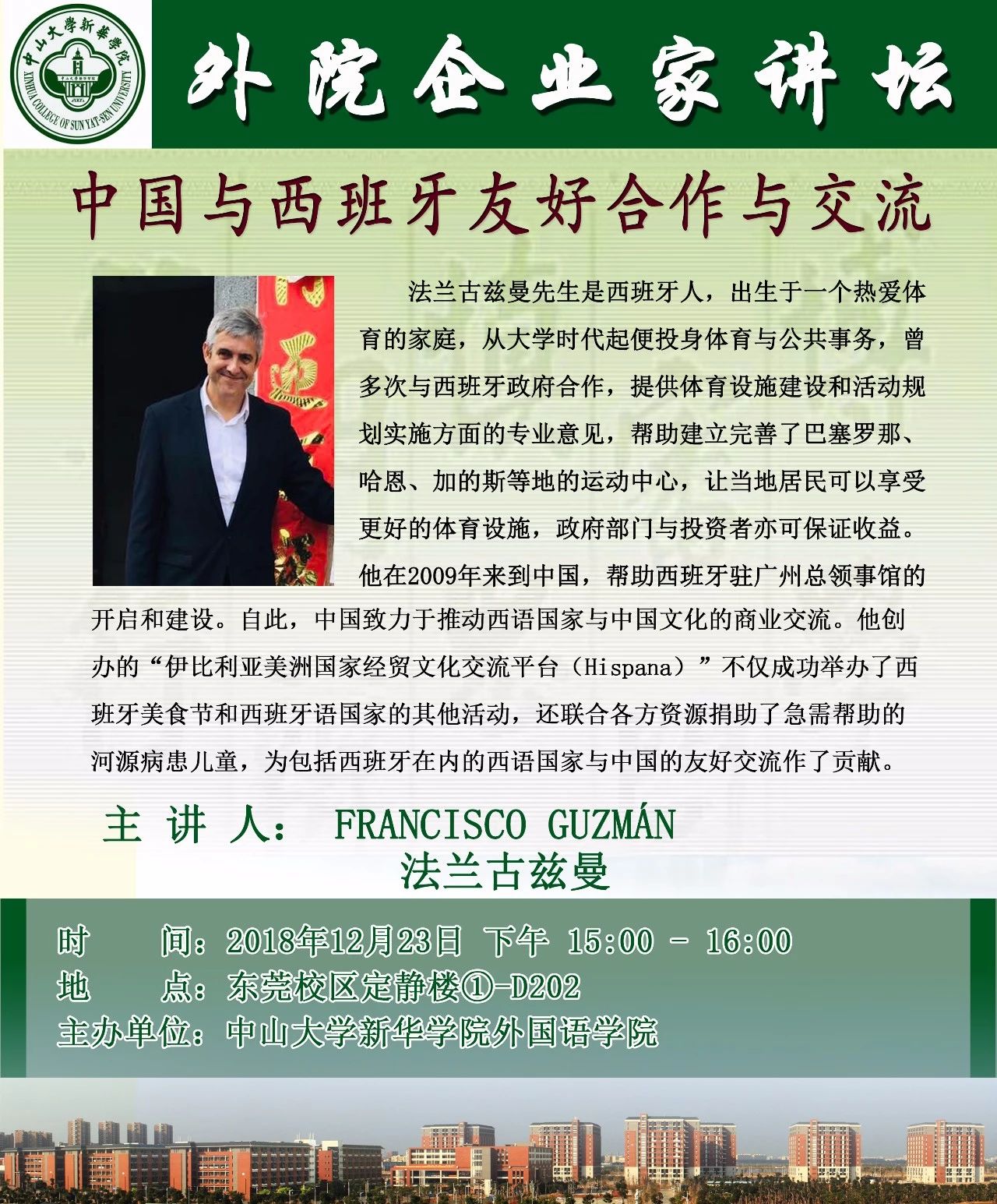 主讲人简介:法兰古兹曼先生是西班牙人,出生于一个热爱体育的家庭,从大学时代起便投身体育与公共事务,曾多次与西班牙政府合作,提供体育设施建设和活动规划实施方面的专业意见,帮助建立完善了巴塞罗那、哈恩、加的斯等地的运动中心,让当地居民可以享受更好的体育设施,政府部门与投资者亦可保证收益。他在2009年来到中国,帮助西班牙驻广州总领事馆开启和建设。自此,中国致力于推动西语国家与中国文化的商业交流。他创办的“伊比利亚美洲国家经贸文化交流平台((Hispana)”不仅成功举办了西班牙美食节和西班牙语国家的其他活动,还联合各方资源捐助了急需帮助的河源病患儿童,为包括西班牙在内的西语国家与中国的友好交流作了贡献。