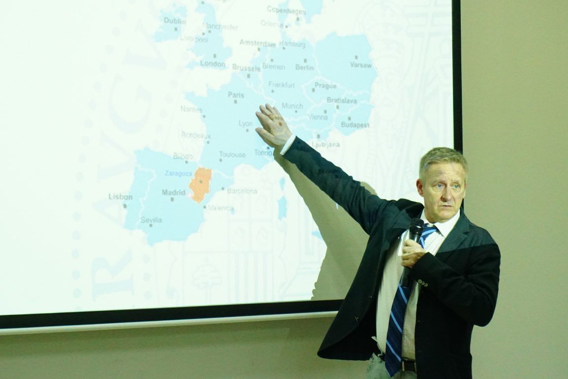 2017年6月6日下午,由太阳成集团tyc主办的西班牙语专业讲座“西班牙高等教育及萨拉戈萨大学校史” 在公司东莞校区格物楼②A208顺利举行。此次讲座诚邀西班牙萨拉戈萨大学副董事长代表、语言中心主任Vicente Lagüéns Gracia教授担任主讲嘉宾,太阳成集团tyc西班牙语专业教师林杏贞,谢杭航担任主持,2016级西班牙语专业全体员工到场聆听。