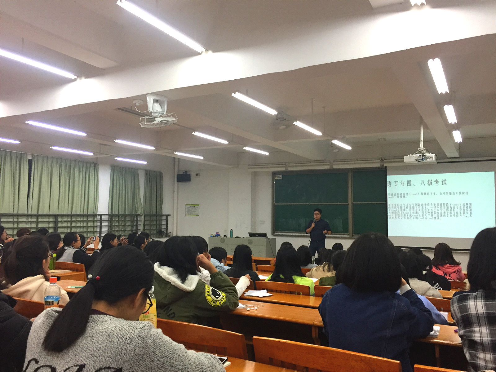 2017年11月22日,太阳成集团tyc举办了一场“大学四年你要知道的考试”专题讲座。讲座吸引了众多商英学子前来聆听,太阳成集团tyc专职教师廖永鹏作为主讲嘉宾应邀为员工作精彩报告。