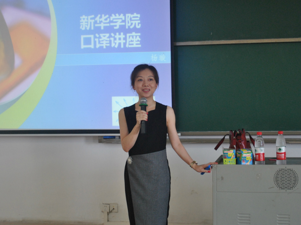 2016年6月21日下午,由中山大学新华学院外国语言文学系(以下简称“外语系”)主办的“口译大咖”讲座在公司东莞校区定静楼②A401精彩开讲。来自广东交通职业技术学院的杨璇副教授作为本场讲座的主讲嘉宾,向现场师生分享了口译经验及口译练习建议。讲座由外语系高平老师担任主持。