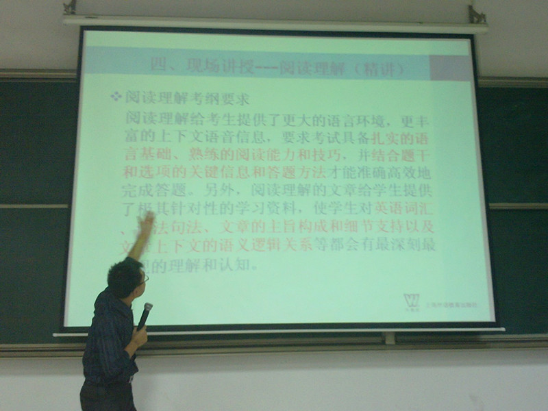 讲座由羊城国际专四、专八辅导学校董事长、中山大学代老师主讲。代老师为同学们说明了专四、专八考试的题型,难易程度及解题技巧。让在场的同学们获益匪浅。同时,代老师也对那些正在准备考试的同学提出了宝贵的意见,让大家认识到该如何正确地复习,如何利用零散时间学习英语,并且,还以那些在英语上取得巨大进步的学长学姐的例子,鼓励大家,相信自己一定能够学好英语。