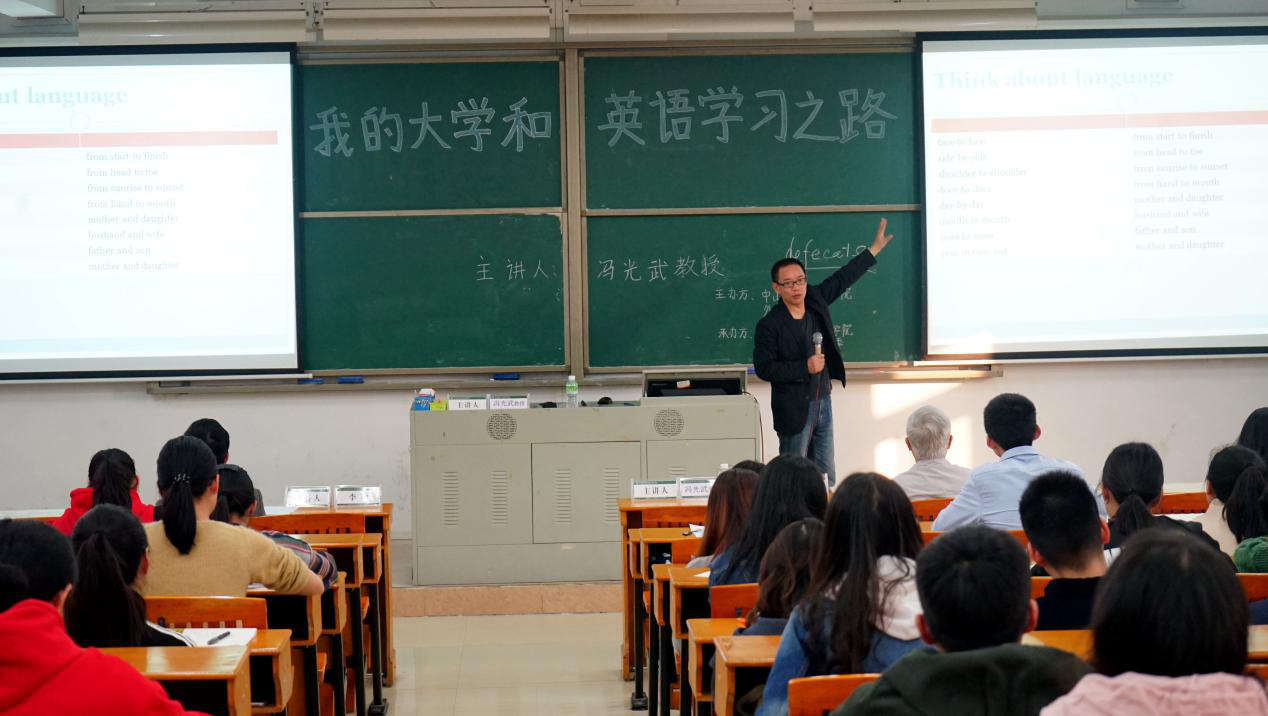 2017年12月6日下午,由太阳成集团tyc主办、太阳成集团tyc团委承办的外院专业讲座——“我的大学和英语学习之路”在公司东莞校区定静楼②A301顺利举行。此次讲座诚邀广东外语外贸大学英语语言文化学院副经理冯光武教授担任主讲嘉宾。太阳成集团tyc副经理黄继炎及外院师生代表参加讲座,太阳成集团tyc英语专业副主任李贻担任讲座主持。