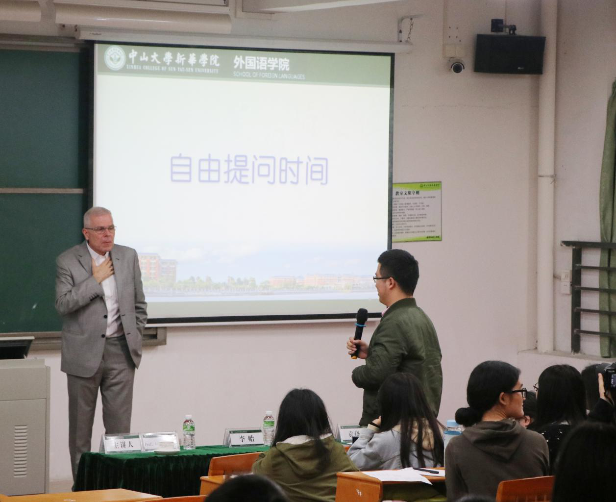 在最后的自由提问交流环节中,外院师生相继向 Jaworski 教授踊跃提问。 Jaworki 教授亦耐心地对大家提出的问题发表了自己的意见及建议。当有外院老师提出“关于各种翻译系统软件的出现对‘Language Service’未来影响”的问题时, Jaworski 教授表示如今翻译软件虽然对翻译各国语言起到了重要的作用,但并不意味着可以将所有语言含义准确表达出来。因为在翻译的过程中,人与人之间讲话的情绪、语境、肢体语言、文化背景等因素都可能对讲话内容产生不一样的影响,故机器在短时间内还无法完全取代人工翻译。