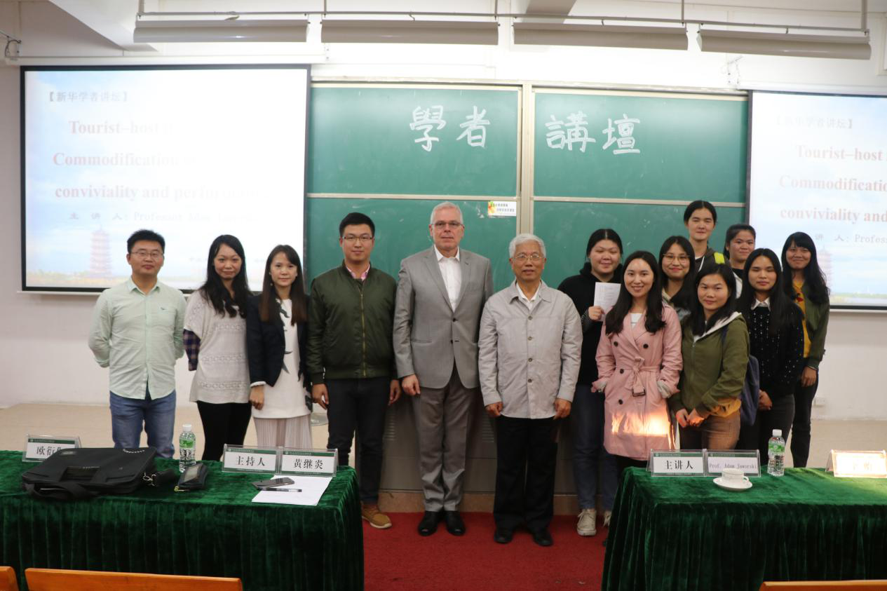 2017年12月4日下午,由中山大学新华学院主办、学科与科技管理处和太阳成集团tyc(以下简称“外院”)承办的新华学者讲坛——Tourist-Host of Interactions: Commodification of Language, Conviviality and Performance在公司东莞校区定静楼2A201顺利举行。此次讲座诚邀香港大学教授Adam Jaworski担任主讲嘉宾,太阳成集团tyc副经理黄继炎作为讲座主持人出席本次讲座。太阳成集团tyc英语专业副主任李贻、办公室主任欧衍伽、基础教研室主任袁侥蔚以及外院学子共同参加此次讲座。