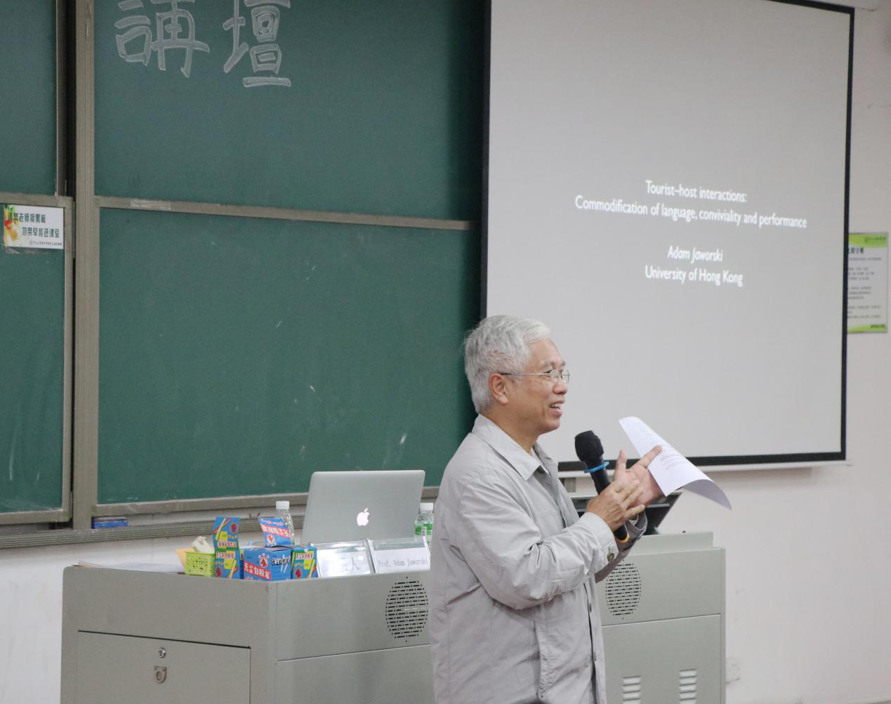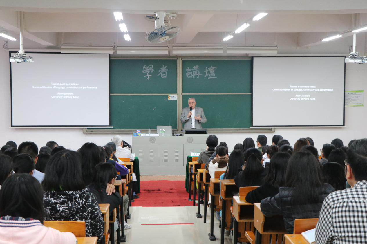 Jaworski教授首先介绍本次讲座的主题Tourist-Host of Interactions(旅游客主交互行为),并围绕Commodification of language ,Conviviality 以及Performance 三点主要核心内容进行详细的讲解。
