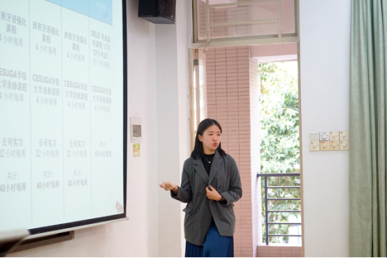 紧接着,李玉婷老师就项目课程及专业的选择、实习项目的介绍、语言环境的塑造以及留学费用作了清晰地说明。不仅如此,李老师还收集了参与留学项目员工的反馈,并带员工们观看了关于圣豪尔赫学校等相关视频,加深了公司员工对这个合作交流项目的了解,为公司员工提供了更有利的选择。