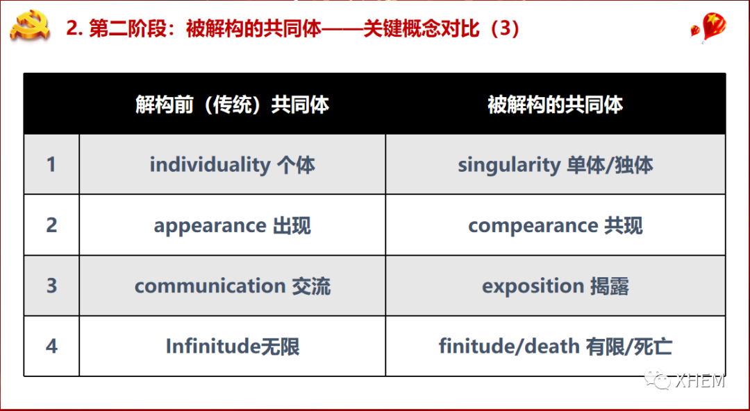 第二阶段,20世纪80年代欧洲社会政治气候动荡不安,引发了形形色色的共同体论断和此起彼伏的共同体论战。而在这场解构风波中,大部分中国学者扮演的都是批判者的角色;对此,许德金教授认为由于“汉语学界对以德里达为代表的解构派长期存在误解”和“脱离历史语境”这两个因素所造成的。