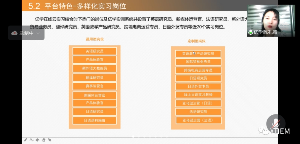 在2020年疫情期间,与亿学合作推动云实习项目的高校覆盖全国28个省市,超过20000名高校员工通过亿学云项目顺利完成实习任务。同时,陈经理也指出了项目在目前企业用人、高校员工实习需求,对于线上实习项目可行性和必要性的有利条件。目前亿学云实习平台针对英语和商务英语专业员工提供的实习岗位种类非常多,涵盖了商务英语、英语、日语等专业的对口就业方向,包括了如英语教学、国际贸易研究、平台运营等几个重要的教学方向。