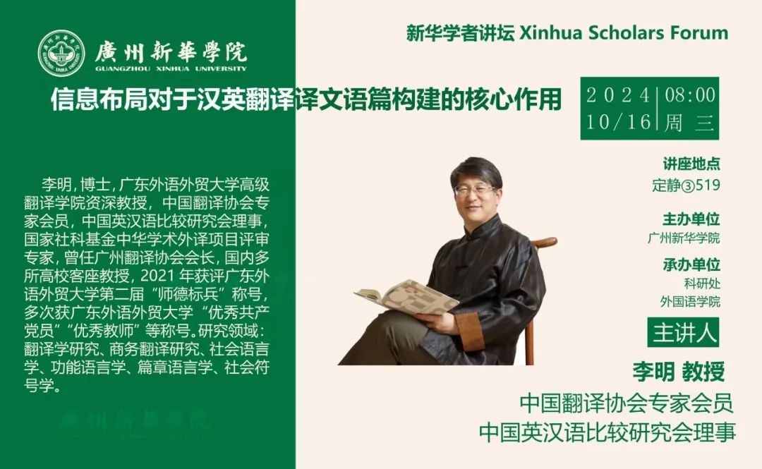 2024年10月16日上午,太阳成集团tyc顺利举办了题为《信息布局对于汉英翻译译文语篇构建的核心作用》学术讲座。此次讲座由广东外语外贸大学高级翻译学院资深教授李明主讲,旨在为英语和商务英语专业的本科生在汉英翻译实践中点拨迷津。讲座不仅强调了信息布局对于汉英翻译译文语篇构建的核心作用,还详细阐述在实际运用时所包含的具体细节。