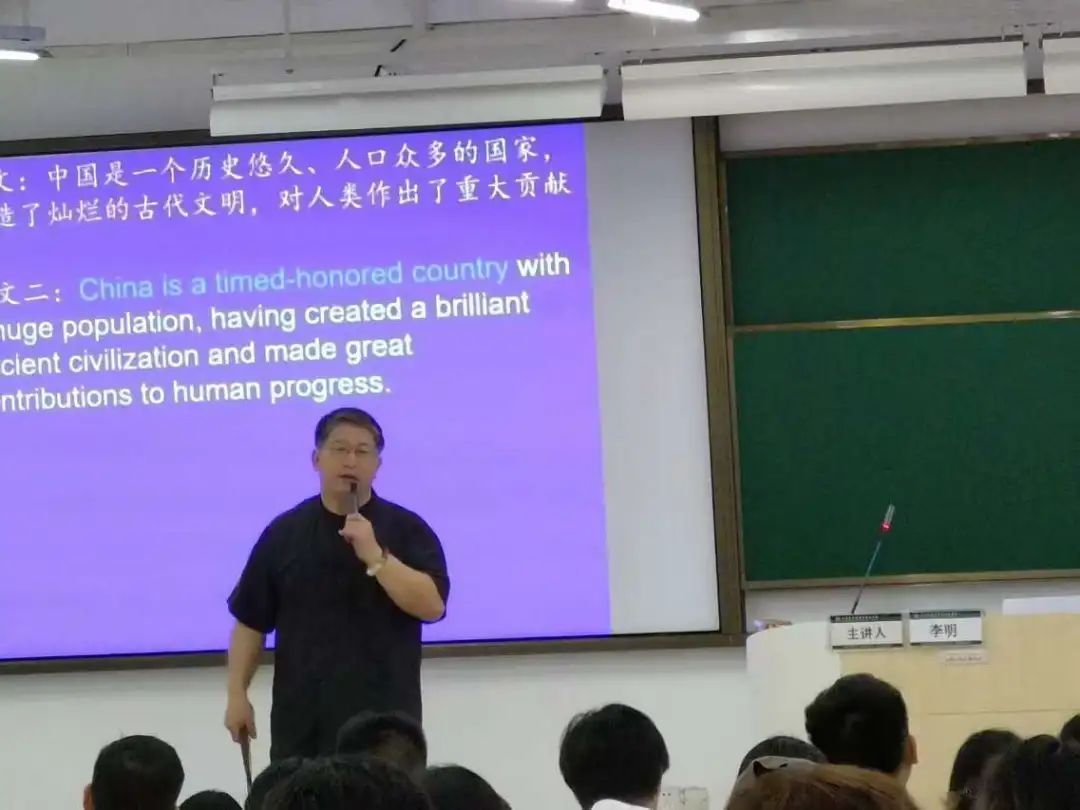 讲座伊始,李明教授在讲座向听众介绍了信息布局在翻译实践中的重要性。他强调,英汉两种语言在信息呈现上的差异性质显著:英语倾向于在句首或句尾突出关键信息,创造出一种“焦点式”的句子结构;相对而言,汉语更重视信息的逻辑性和语境的连续性,倾向于形成“流水式”的句子结构。据此,李教授指出,在进行汉英翻译时,调整信息布局是确保翻译质量的关键步骤。