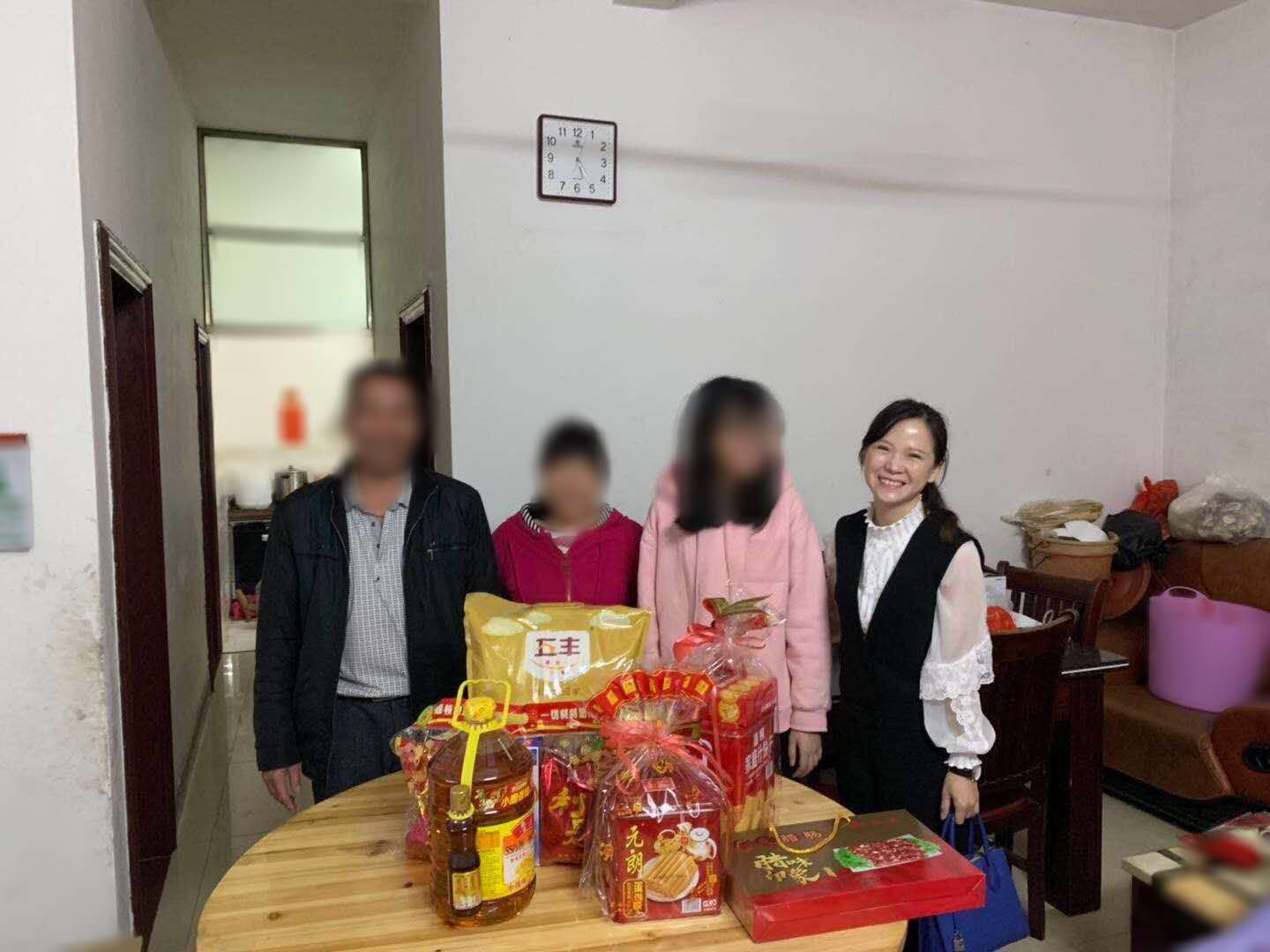 教师代表欧衍伽与家庭经济困难员工家庭合影留念