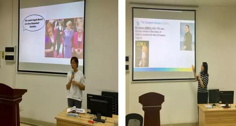 接下来由公司大英教师洪茹、于铭华老师进行平时课堂展示。洪茹老师在会上进行了大三员工的二外德语课堂讲授。她通过购买衣服的例子向大家展示德语的第一格与第四格的形容词词尾变化以及德语的反身代词的运用。于铭华老师讲授的是大学英语综合教程第二册的Unit6,主题为"Women, Half the Sky"(女人,半边天)。这几位老师的课堂展示各具其独特的风格,在座领导老师对她们一一进行了点评并给予修改建议。