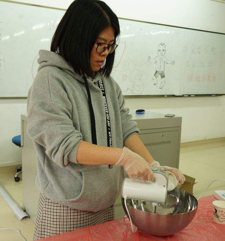 在杨景梅老师的讲解过程中,老师们纷纷动手参与到蛋糕的制作中。其中,黄继炎督导表现十分积极,打发蛋白的成品特别黏稠。各位老师们都融入其中,现场一片欢声笑语。