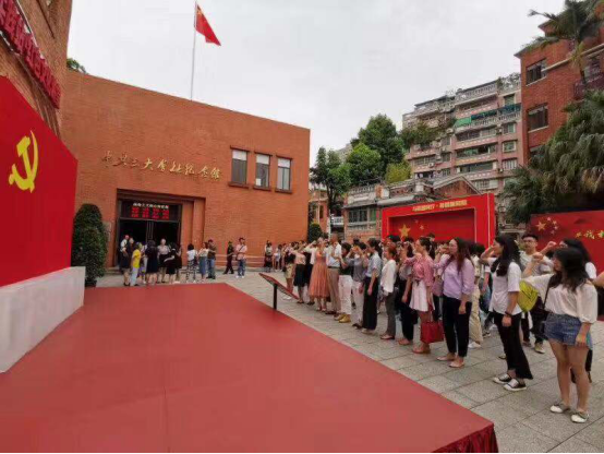进入会场前,外院所有党员师生与音乐系党员师生一起于中共三大会址广场党旗前庄严宣誓。外公司党总支副书记欧衍伽领誓,面对鲜红的党旗,全体党员举起右手、紧握拳头,重温入党誓词。