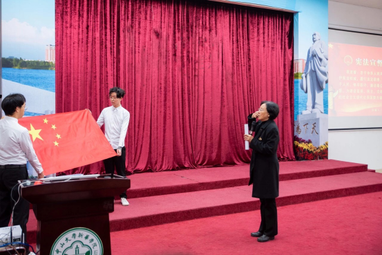 外院师生党员代表与来自全校近400名师生代表一同观看了教育部在北京全国青少年员工法治教育实践示范基地举办的“宪法晨读”活动直播,同步跟读宪法部分条款,面向宪法和国旗庄严宣誓,齐声合唱歌曲《我和我的祖国》。宪法宣誓仪式由法公司党总支书记李岚同志领誓,党委宣传部副部长(主持工作)刘英同志主持活动。