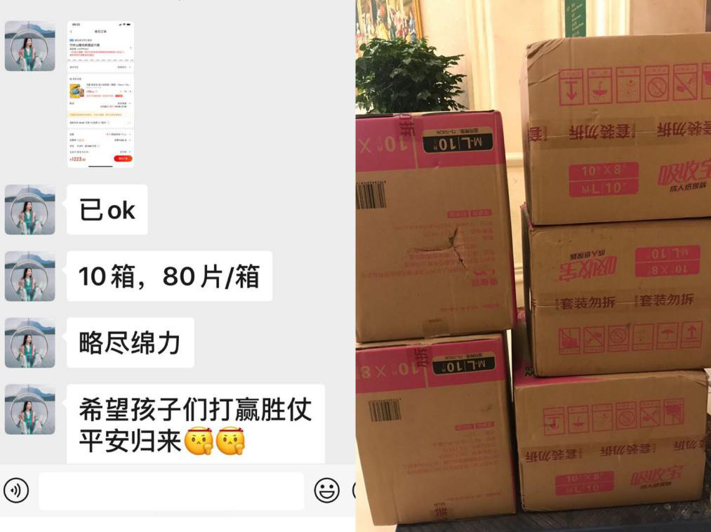 2月16日早上,李文蓓老师向护理学院王秀岚经理一番打听后,了解到前线战“疫”存在物资短缺的情况,加上寒流袭击,使前线医护人员处境艰难。迅速地,她在确认清楚武汉的物流情况后,通过网络平台订购了一批物资,为“最美逆行者”解决一些燃眉之急,并且衷心希望他们能在奋战的同时保护好自己。随后,她委托王经理向他们送上自己最真挚的祝福和敬意:打赢战“疫”,平安归来。