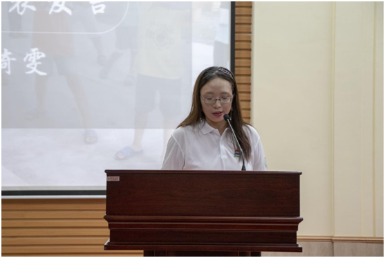 随即是师生代表发言环节,师生各一位,而陈绮雯老师作为其中的教师代表上台发言。