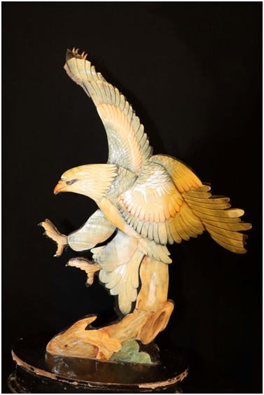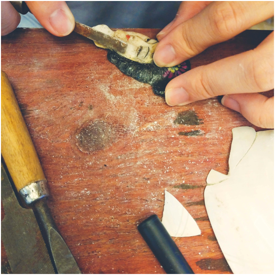 Afterwards, the configuration of shells are to be cut off according to the same-size ratio schema. Moreover, the texture is then exquisitely polished and carved with a carving knife. Ultimately, the polished shell carving segments with glue in accordance with the pasted into the style of flat-labeled shell carving. After that,a simple shell carving product is finished.