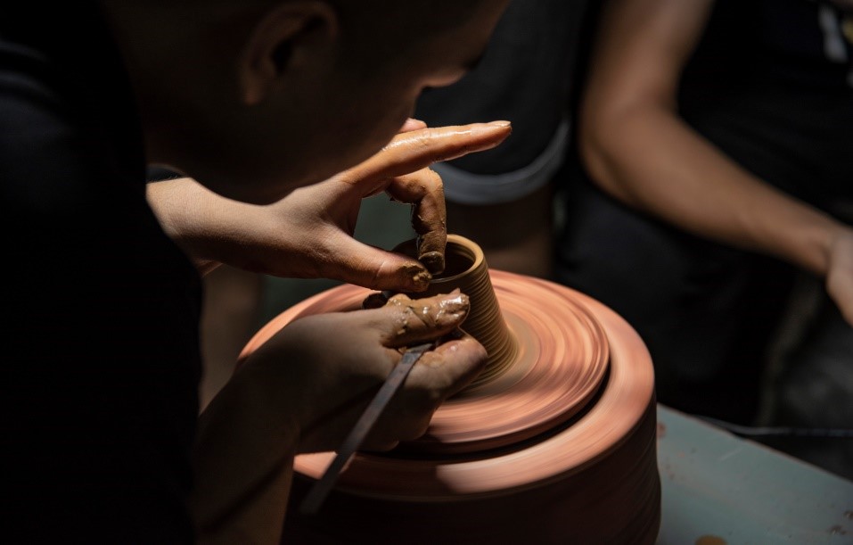 在工作室里,队员们满怀好奇地观看并参与了手拉壶制作的全过程。看着手中的朱泥在匠人们的巧手下变成造型精美的手拉壶,队员们感受到了壶艺匠人技艺的精妙,领略到了手拉壶独特的外在风华。