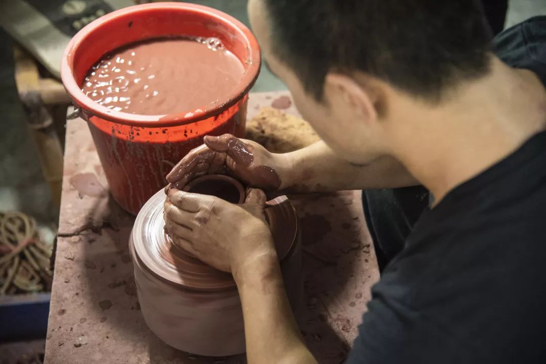 制作一个完整的手拉壶需要经过揉泥、拉壶身、拉壶盖、修坯、钻孔、装壶嘴、镶壶把、装窑与烧制、检查八道工序。首先将成块的熟泥置于平台上,以双手手掌反复揉捏排出泥中的空气,加入适量的水保持泥料干湿适度,从而确保手拉壶的烧制质量。其次,把熟泥放在圆形石板上通电另其转动,双手拇指按泥团上方,其余四指握紧泥团,开底,慢慢拉高壶壁,拉出所想要制作的造型后再作调整。拉完壶身后,需先用钢制尺子量壶身的壶口来确定壶盖的大小制作壶盖。拉完壶盖后,待壶盖壶身阴干后在转盘上进行旋削修整,直到壶体表面平整光润,厚薄均匀。在拉好壶盖后需在壶身上找准位置钻孔与安装壶把壶嘴,令壶嘴、壶把、壶口在同一平面上,俗称“三山平”。待壶嘴壶把安装完毕后,将完全阴干的手拉壶放置于电窑中烧制,烧成时间为10-12小时,根据不同泥料的特性设置烧成曲线图,烧成后再经12小时退火降温便可出窑。最后便将手拉壶成品给老师检查,不断完善其瑕疵部分,一个精美的手拉壶便诞生了。