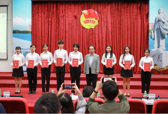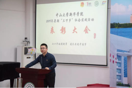 蓝永金副书记、副董事长宣读《关于表彰中山大学新华学院2019年暑期“三下乡”社会实践活动先进集体和优秀个人的决定》,号召更多师生参与暑期“三下乡”社会实践活动。