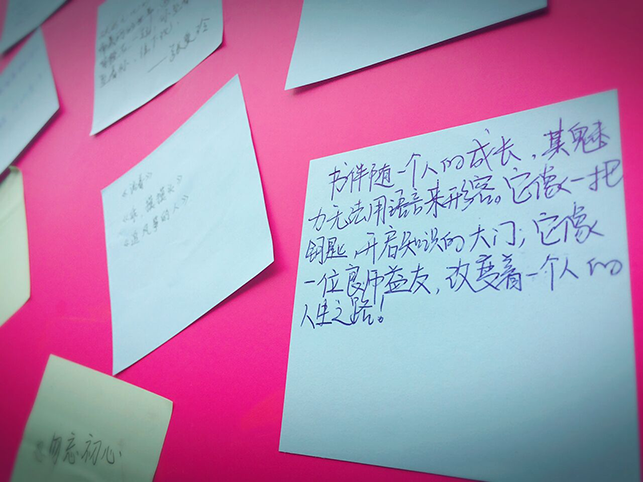 外语系员工会准备了精美的小本子和小零食,作为分享者的礼物,同时在各校道进行宣传和派发宣传单,让更多的人了解并参与到活动中。不少同学都在小纸条上写下了自己看过或喜欢的作品,还分享了自己读书过程中的收获和感受,更有用同学英文写下自己的读书感悟,并将它贴上了分享板上。在分享板上,贴满的是每一个人独特的见解。分享板也吸引了很多眼球,不仅仅是分享给别人,自己也能从这一张张纸条中了解到更多的作品,看到不同的人对同样的书的见解。