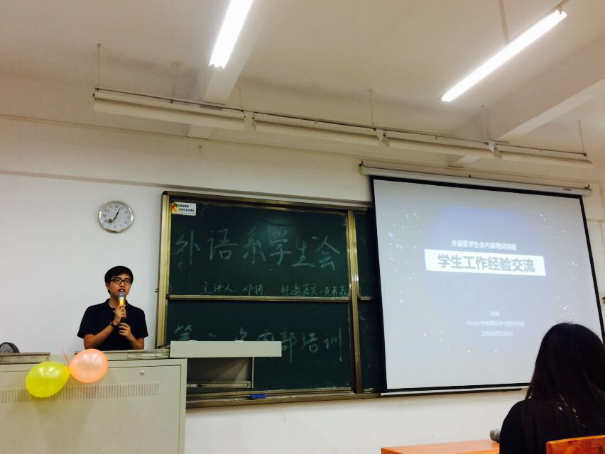 2016年5月26日晚,以“在有限的时间内投入无限的热情”为主题的外语系员工会内部培训讲座在公司东莞校区教①A302举办。本次讲座诚邀中山大学地理科学与规划学院12级本科生邓铸及中大国际关系学院12级本科生黄萧嘉同学作讲座嘉宾,与外语系员工干部交流管理经验及实践心得。外语系员工会干部、外语系团总支干部以及员工会干事、团总支干事共同参与培训。