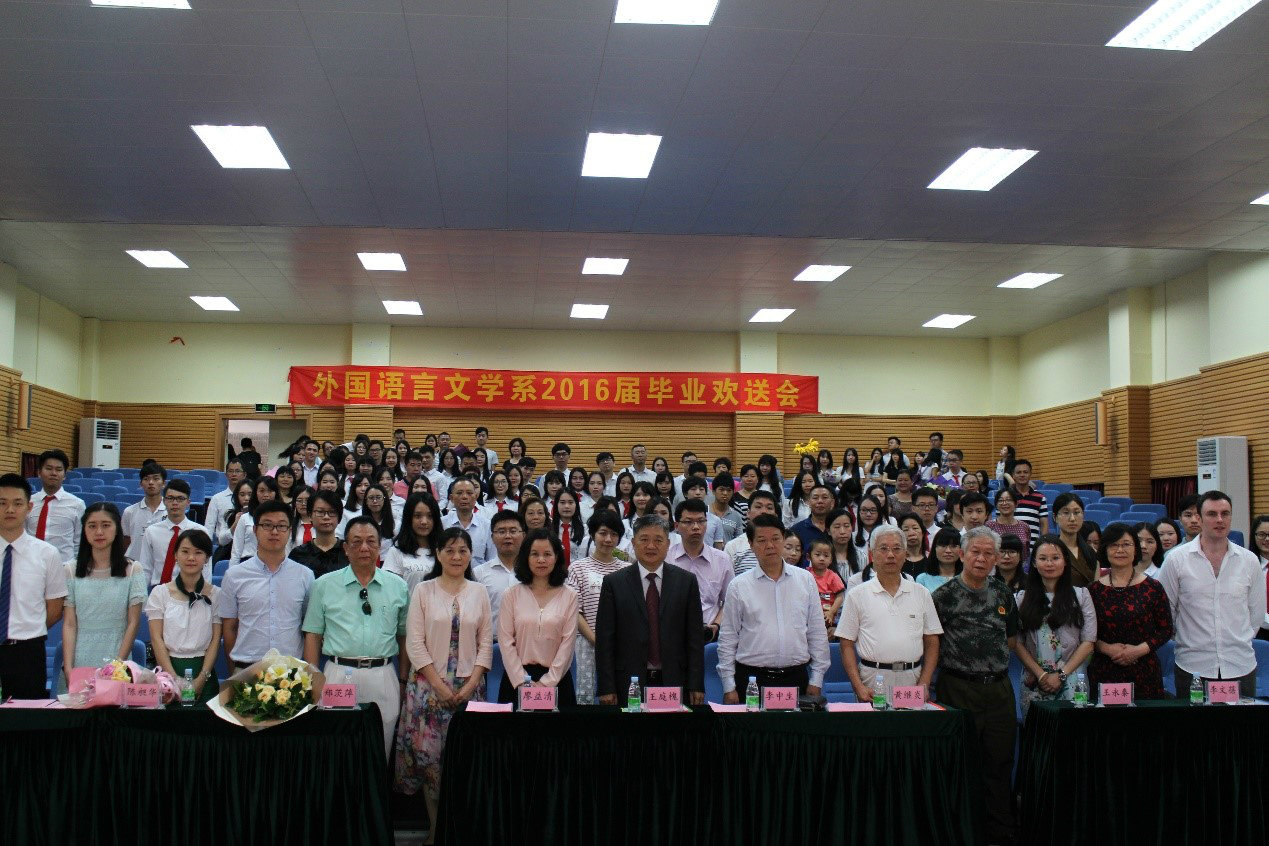 2016年5月22日上午,中山大学新华学院2016届外国语言文学系毕业生欢送会于公司定静楼①F403举行。学院经理王庭槐、副经理李中生、外语系主任廖益清、外语系副主任黄继炎、英语专业副主任李贻、外语系教授邱易安、副教授郑茨萍、副教授王永泰、家长代表陈昶华先生作为嘉宾出席,并与外语系师生齐聚一堂,共同欢送外语系2016届毕业生。