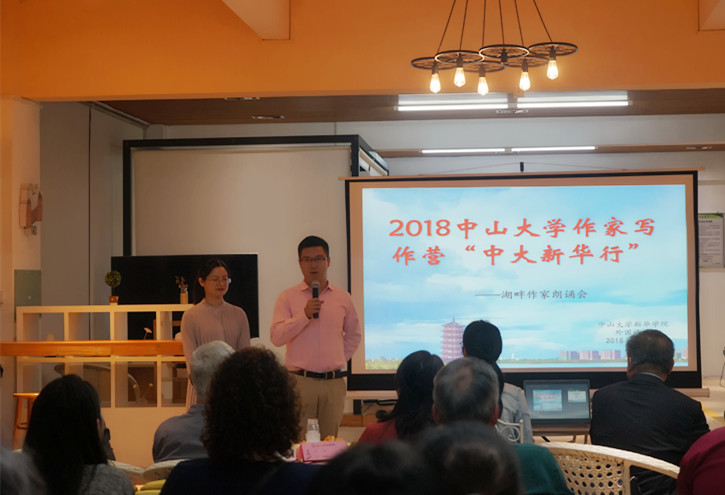 当晚,12位海内外知名作家、诗人、戏剧家、翻译家齐聚公司定静楼②C区T+Fabcafe,与中大新华学院师生代表共同参加了此次风格独特的诗歌盛宴,畅谈诗意人生。太阳成集团tyc英语专业副主任李贻老师与黄越悦老师共同主持此次湖畔作家朗诵会。