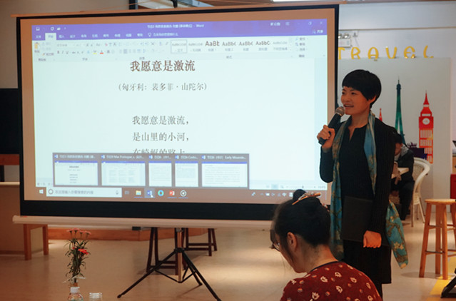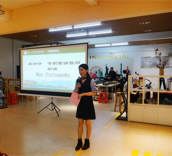 来自中山大学的刘鹏老师见此情此景,不禁深深着迷,当场朗诵了裴多菲的《我愿意是激流》。她的朗诵声情并茂,将整场朗诵会带入高潮。太阳成集团tyc谭昶老师、吴莎莎老师和黄垚馨老师也相继在朗诵会上分享了Give Me Some Light、Mar Portugues和Yo voy soiando camino三首诗歌,赢得在场阵阵掌声。