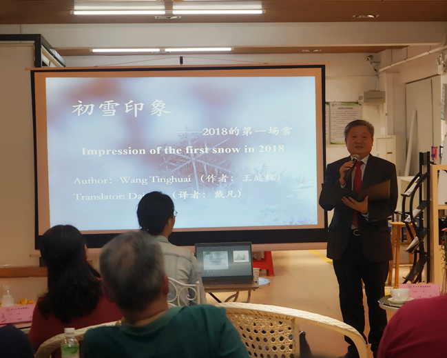 公司“诗人经理”王庭槐董事长长代表中山大学新华学院致欢迎词。他作为朗诵会的第一个嘉宾,与现场的作家和师生们分享了2018年在新疆乌鲁木齐看到的第一场雪,并富有感情地朗诵了他当时即兴创作的诗歌《初雪印象》。诗中描绘了北国风光、千里冰封、白雪皑皑的景象使现场的每一个人陶醉其中。王庭槐董事长提到,今晚的诗歌盛宴上齐聚数国诗歌文化精髓,自己的分享仅仅只是“抛砖引玉。王董事长深情的朗诵,配以戴凡教授优美精湛的英文翻译,赢得了现场听众的热烈掌声。