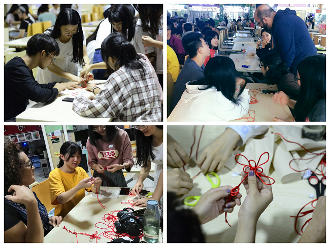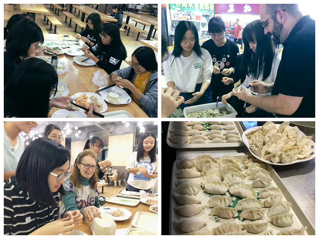 卓越班全体同学和周亭老师及外教Susan、Luz、Ramon在食堂动手包饺子和通过学编织中国结来体验和传承中国传统文化,他们全程用英语进行互动交流。