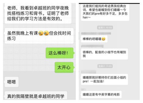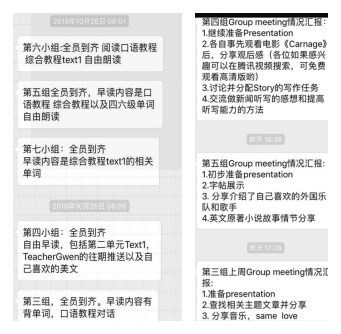 A: 除了例行的作业安排,周亭老师每天会给我们分享很多学习英语的课外资源,比如雅思托福的考试真题和学习渠道、语音语调的练习视频、语法书的推荐和外国礼节文化知识、适合我们在Futurelearn 或 Coursera上的与我们主专业相关但授课语言是英语的MOOC等,我们都会自觉点击查看学习。此外,我们都是小组分配一起学习,每天大家会一起早读练习口语。而且每周会开展一次学习小组的分享会,分享当周所收获的学习成果--包括英文原著的阅读、、朗诵喜爱的诗歌、赏析彼此当周写好的英文字帖。其实做这些事并没有觉得是在督促自己,而是享受和小组成员一起学习英语的氛围,内心很满足。