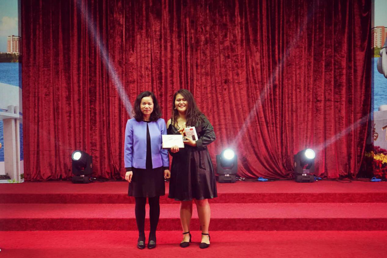 太阳成集团tyc经理廖益清(左)与一等奖获奖选手朱叶露合影留念