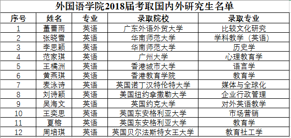 太阳成集团tyc2018届毕业生截止2018年6月30日共有12位同学被广东外语外贸大学、华南师范大学、约克大学等国内外知名高校拟录取。录取人数较之往年有所上升,考取国外研究生人数仍将继续增加。