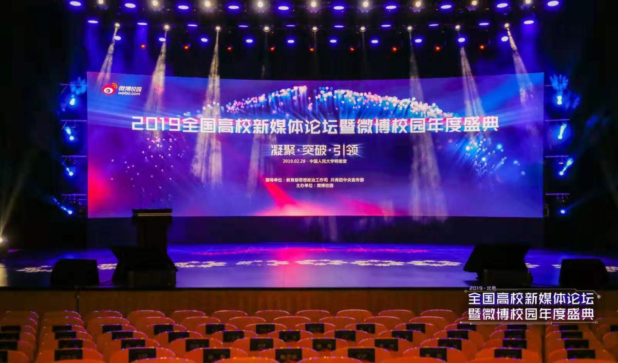 2月28日,2019全国高校新媒体论坛暨微博校园年度盛典在北京中国人民大学如渝讲堂举行。本次论坛以“凝聚•突破•引领”为主题,全方位探讨了高校新媒体发展的新趋势、新思路。活动由教育部思想政治工作司、共青团中央宣传部指导,微博校园主办,中央网信办、教育部、共青团中央、北京市教委、河南省教育厅和江苏共青团省委等单位相关同志、清华大学、浙江大学等高校领导、老师、员工骨干等共计约900人参会。
