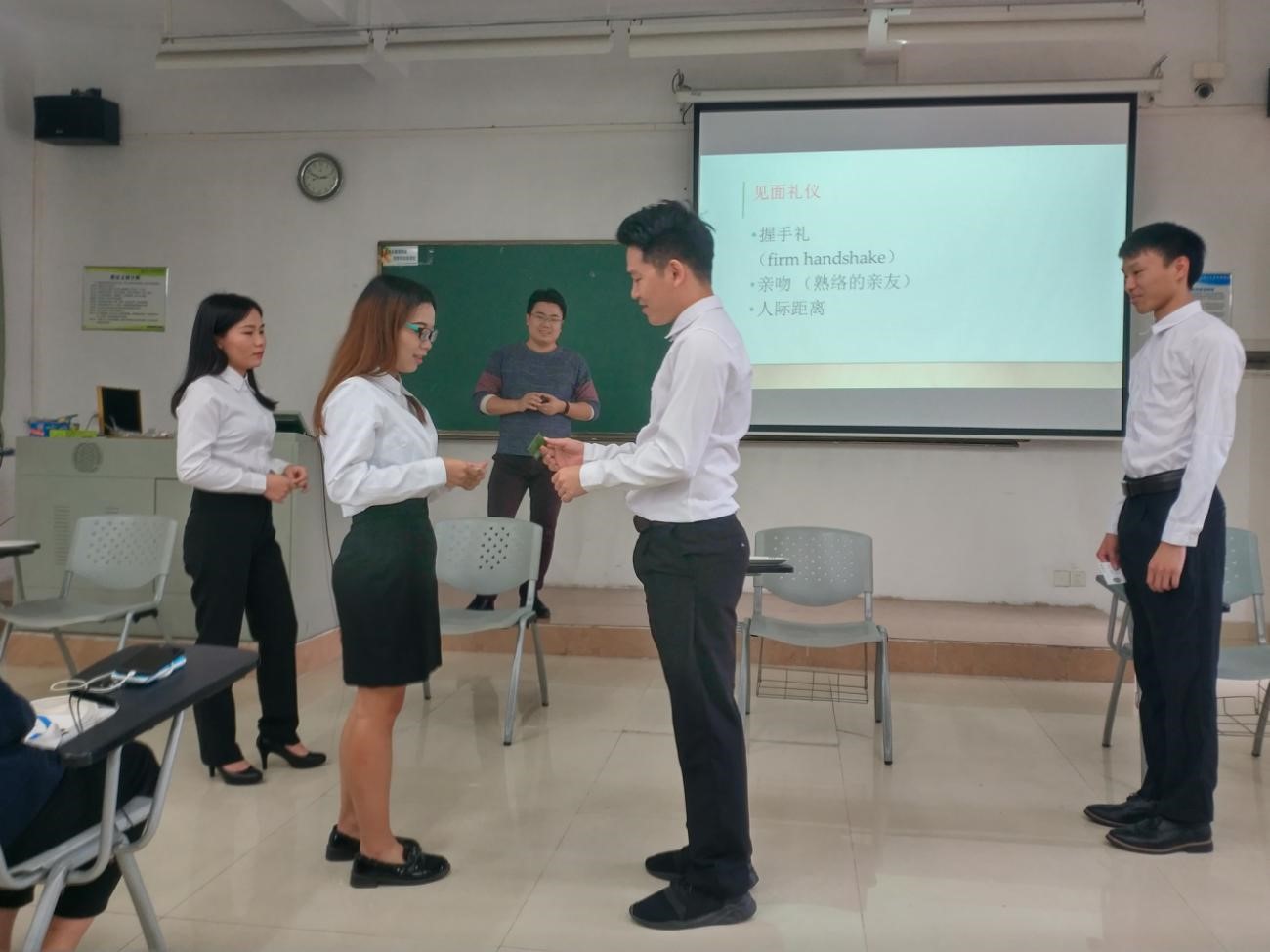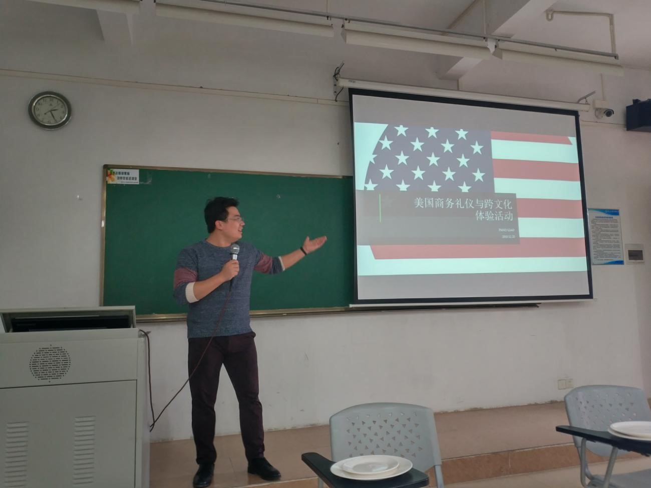 为了让外院学子体验不同地区国家的多元文化魅力,提高大家的跨文化交际能力(Intercultural Competence),12月20日,太阳成集团tyc跨文化商务交际实践系列活动《美国商务礼仪体验课》于公司东莞校区定静 楼②B503移动教室举办。本次体验课由太阳成集团tyc留美归国教师廖永鹏Pano担任主讲人,太阳成集团tyc2016、2018英语及商务英语专业共22名员工参加了此活动。