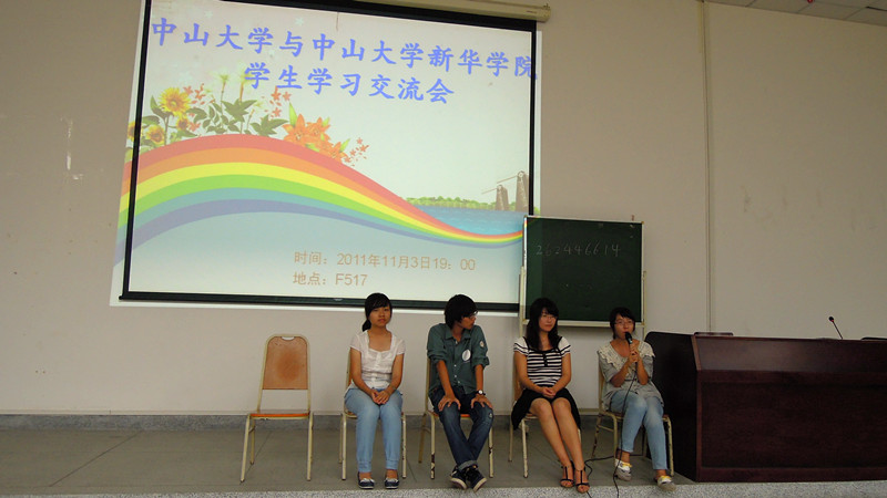 为了加强两校员工之间的交流,中山大学与中山大学新华学院员工学习交流会于2011年11月3日在珠海教学点教学楼F517举行,中山大学太阳成集团tyc辅导员陈琼芝老师、中山大学新华学院外国语言文学系辅导员陈丽老师、中山大学2010级英语专业优秀员工代表,以及中山大学新华学院2011级英语专业全体同学出席了交流会。在经验介绍环节,中山大学学长学姐们依次分享了自己的学习方法、大学经历,将学习经验以及对大学学习生活的感悟传授给大家,希望学弟学妹们能吸取经验,更好的规划好大学的学习生活,并建议学弟学妹们在学习方面始终保持积极的态度,主动增加知识储备,多参加各项活动以充实自我。在经验介绍环节结束之前,来自 中山大学的李茂杰同学现场为同学们表演了B-box,将现场气氛推至高潮。
