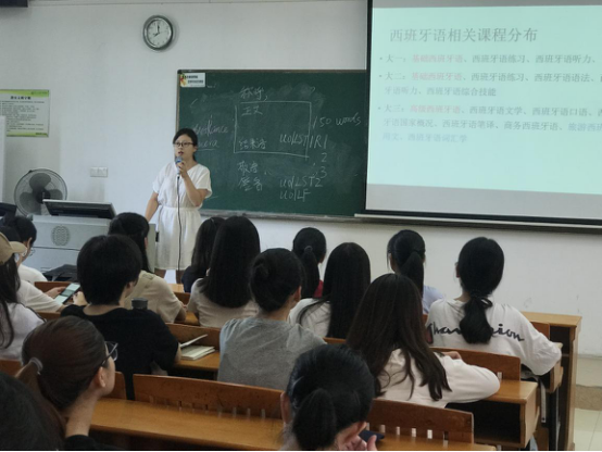 本次介绍会由专业负责人许婷芳老师主持。会议伊始,许婷芳老师首先为新生介绍了公司西班牙语专业建设和团队情况,随后针对大学四年各个年级的课程设置作了详细说明。期间,许婷芳老师尤其强调了专业等级考试的重要性,以及出国交换和留学读研的注意事项。对于新生们即将开始的西语学习之旅,许老师提出了自主学习、勤于思考、大胆开口、尊师重道的四个要求,在场新生们以坚定的目光给予老师肯定的回应。