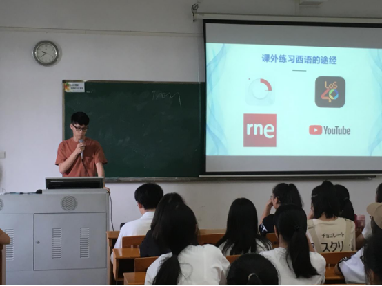 在最后的经验分享环节中,来自17级西语专业的张奇聪同学上台分享了自己的经验,做出了自己的总结,这为西语专业师弟师妹们以后的专业课学习照亮了前进的方向。对于新生们的问题,师兄也一一做出了解答,并给出了一些建议。